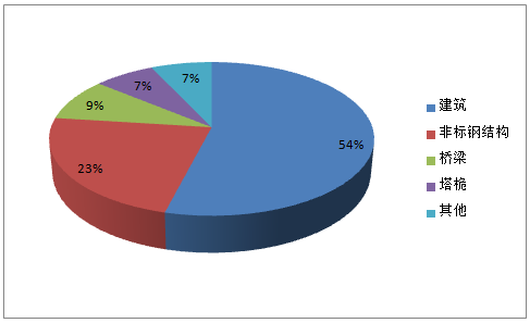20 世紀 90 年代之前,中國由于鋼材短缺,國家實行節(jié)約用鋼政策。隨著鋼鐵產(chǎn)量快速提升,1997年建設部則提出合理使用鋼材,發(fā)展鋼結構。1998年則提出將鋼結構作為建筑新技術進行推廣應用,隨后政策轉(zhuǎn)向支持和鼓勵,鋼結構行業(yè)迎來快速發(fā)展, 產(chǎn)量從2004年的1300萬噸增長至2013年的3650萬噸,年均增長 12%。目前鋼結構廣泛應用于下游工業(yè)廠房、高層及超高層建筑、航站樓、火車站、火電廠、橋梁等。建筑、非標鋼結構、橋梁、塔桅和其他分別占鋼結構消耗量的 54%、23%、9%、7%和 7%。而在建筑鋼結構中,消耗量最大的是廠房和高層建筑,分別占建筑鋼結構的 51%和 20%。