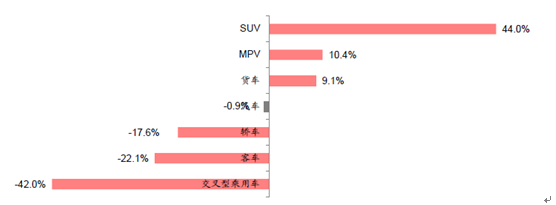 乘用車分車型看,SUV 依然增長最快,2 月銷量同比增長44.0%,MPV、轎車和交叉型乘用車銷量增速分別為10.4%、-17.6%和-42.0%。