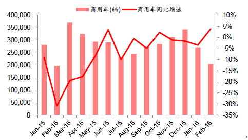 據中汽協統計,2016 年2 月,汽車產銷環比大幅下降,同比微降。2 月,生產汽車161.18 萬輛,環比下降34.43%,同比下降1.31%;銷售汽車158.09萬輛,環比下降36.94%,同比下降0.86%。細分來看,2 月,銷售乘用車137.67萬輛,同比降低1.53%;銷售商用車20.42 萬輛,同比增長3.90%。
