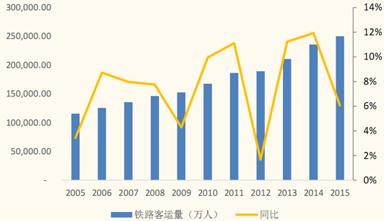 2、鐵路客運方面,受益于高鐵的廣泛應用,鐵路運力釋放,促成客運需求上升。全國客運量近10年年復合增長率維持在 8%左右,2015年突破25億人次。