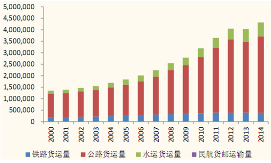 2001-2014年中國各交通方式運輸量對比