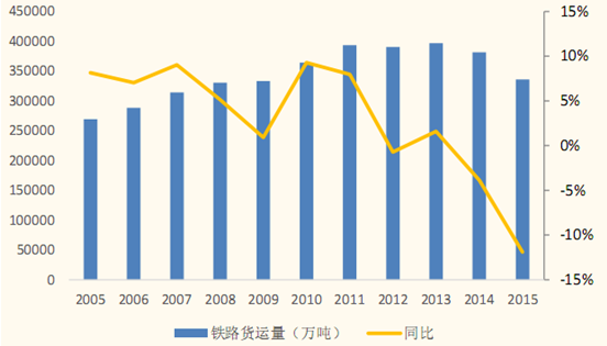 2005-2015年全國鐵路年貨運量