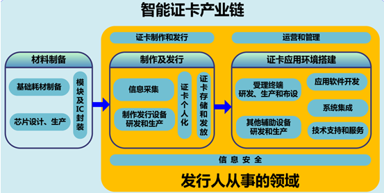 我國智能卡產業發展至今,已經建立了包括耗材制備、證卡制作與發行、應用環境搭建等功能環節的完整產業鏈條。在整個產業鏈條的支持下,各個應用領域的證卡制作發行及應用的運營和管理工作得以順利開展。智能卡產業鏈上下游關系以及公司在產業鏈的位置如下所示: