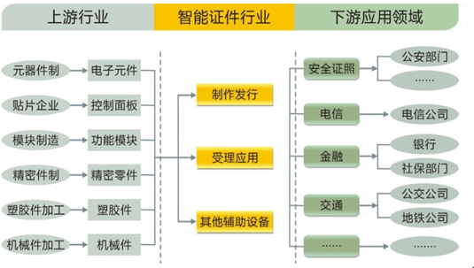 智能證卡行業的上游行業包括芯片和其他電子元器件制造業、面板貼片業、電子設備制造業、塑模業、機械加工業等,下游應用領域和行業包括安全證件、交通運輸、電信、金融等。上游行業近年來發展迅速、競爭充分,技術更新速度快;下游行業通常具有盈利能力強,資金實力雄厚的特點。以上特點均有利于智能證卡行業的持續、快速發展。與上下游行業的關系如下圖所示: