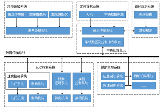 無人駕駛車輛是汽車智能化發展的最終方向,通過使用計算機、傳感器和其他技術設備使車輛在沒有駕駛員的主動控制和連續監測下可以安全行駛。從整車制造角度出發,無人駕駛車輛構造可分為環境感知系統、定位導航系統、路徑規劃系統、中央處理單元、輔助駕駛系統與運動控制系統六大系統。