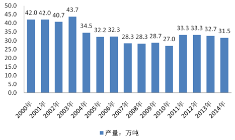 2000-2014年全球木棉果實產(chǎn)量:萬噸