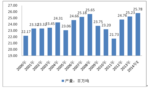 2000-2014年全球高粱(畜牧料)產(chǎn)量:百萬噸