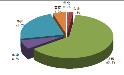 2015年1-9月我國(guó)華北地區(qū)冰箱產(chǎn)量為46.84萬臺(tái),占同期國(guó)內(nèi)總產(chǎn)量的0.7%;華中地區(qū)冰箱產(chǎn)量為465.59萬臺(tái),占同期國(guó)內(nèi)總產(chǎn)量的6.5%;西南地區(qū)冰箱產(chǎn)量為350.18萬臺(tái),占同期國(guó)內(nèi)總產(chǎn)量的4.9%;華南地區(qū)冰箱產(chǎn)量為1660.47萬臺(tái),占同期國(guó)內(nèi)總產(chǎn)量的23.2%;;華東地區(qū)冰箱產(chǎn)量為4506.17萬臺(tái),占同期國(guó)內(nèi)總產(chǎn)量的63.1%。