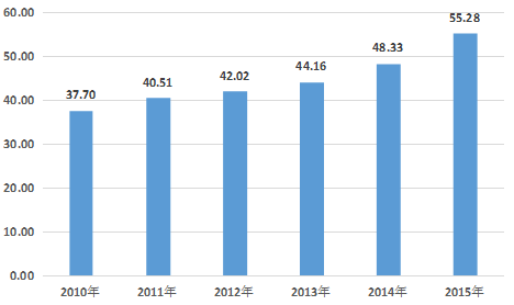 2010年融合通信市場規模在37.70億元,隨著運營商及其他運營服務商的進入,未來融合通信設備市場增長開始放緩,融合通信服務市場份額逐步提升,融合通信軟件廠商也開始逐步涉足向服務市場。2015年設備市場規模達到55.28億元,年增長率為29.7%,同比增長14.38%。