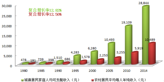 改革開放 30 年來(lái),我國(guó)經(jīng)濟(jì)持續(xù)高速增長(zhǎng),國(guó)民生活水平得到大幅提升,城鎮(zhèn)居民可支配收入、農(nóng)村居民純收入分別從1980 年的 477.60 元、191.30 元上升至2014 年的28,844.00 元、10,489.00元,年復(fù)合增速分別為12.82%、12.50%。