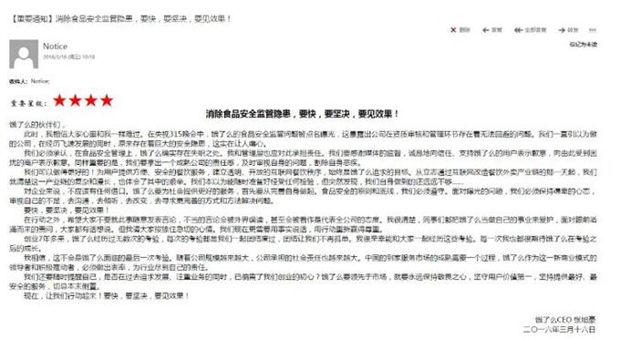餓了么內(nèi)部信:解決食品安全隱患 要快要堅(jiān)決要見(jiàn)效果