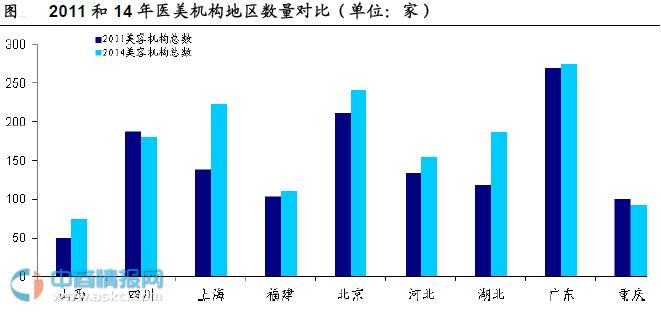 核心提示: 目前我國的整形醫院約有10000家,受經濟發展速度和對外開放程度所限,目前醫美產業地域分布相對集中。根據2011年CAPA對中國十省市醫美市場的調研數據,北京目前我國的整形醫院約有10000家,受經濟發展速度和對外開放程度所限,目前醫美產業地域分布相對集中。根據2011年CAPA對中國十省市醫美市場的調研數據,北京,上海,廣州三地醫美機構數量占了調查總數的46%。而對比2014年和2011年數據,不難發現中國東部沿海地區整體增速大于內陸,但中部地區如湖北,四川等地也發展較快,具備擴張潛能。