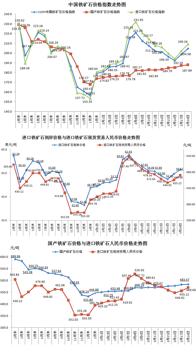 3月18日,中國鐵礦石價格指數(CIOPI)204.58點,環比上升5.66點,升幅為2.84%。其中:國產鐵礦石價格指數為187.89點,環比上升0.75點,升幅為0.40%;進口鐵礦石價格指數為209.26點,環比上升7.03點,升幅為3.48%。