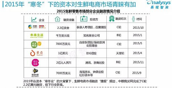 近日,易觀智庫發布《中國生鮮電商市場年度盤點報告2016》,報告對中國中國生鮮電商市場的發展現狀及未來趨勢進行了分析,下面我們來了解一下中國生鮮電商市場發展的現狀。