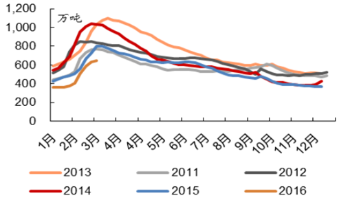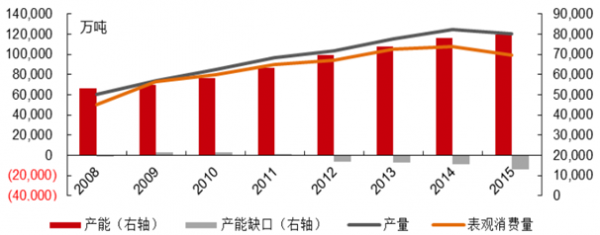 2014 年國內粗鋼產量 8.23 億噸左右,表觀消費量約為 7.39 億噸; 2015 年國內粗鋼產量 8.04 億噸,表觀消費量為 6.98 億噸,粗鋼表觀消費量同比下降 4040 萬噸。 預計未來國內粗鋼表觀消費量在 6~7 億噸區間,加上考慮近兩年出口的 0.8~1 億噸變動范圍,則國內的鋼鐵產量需要在 6.8~8 億噸。