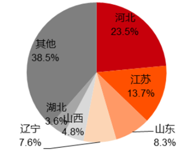 從 2015 年粗鋼產量的地區分布來看,華北、華東、華中及東北地區是粗鋼生產的重要區域;而以省級行政單位分布來看, 河北省毫無疑問是全國第一鋼鐵重鎮。 2015 年河北省粗鋼產量為 1.88 億噸, 粗鋼產能 3 億噸, 粗鋼產能利用率為 63%, 低于全國 67.17%的平均水平。
