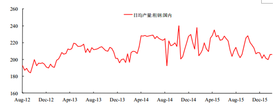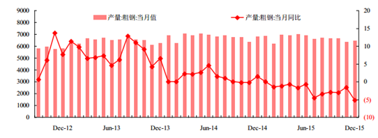 我國粗鋼產量近期一直處于下滑中,12 月份我國粗鋼產量 6437.20 萬噸,同比下降了 5.46%;2015 年全年我國粗鋼產量累計 8.04 億噸,累計同比下降 2.29%。