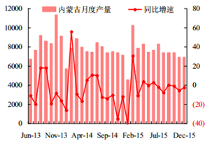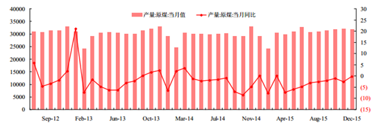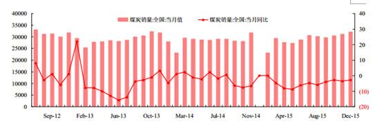產業信息網發布的《2016-2022年中國煤炭市場供需現狀及投資戰略咨詢報告》顯示,2015年12 月份全國煤炭產量為 3.17 億噸,同比繼續下降 0.3%,環比下降 1.1%。2015 年全年全國煤炭累計產量達36.85 億噸,與 2014 年同期相比下降 3.5%。12 月份全國煤炭銷量 3.19 億噸,同比下降 2.7%,環比上升 2.9%。全國煤炭產量及同比增速(單位:萬噸,%)