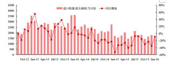 2016 年 1 月份我國煤炭進口數量繼續下滑,當月我國煤炭進口量 1523 萬噸,同比下降了 9.2%。