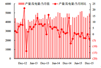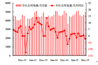 2015 年 12 月我國發電量有所下降,全國發電量當月值為 4910 億千瓦時,同比下降 3.70%;2015 年全年累計發電量達 56184.00 億千瓦時,同比下降 0.20%。全社會用電量當月值為 5006.76 億千瓦時,同比下降 2.15%;15 年全年全社會累計用電量 55499.57 億千瓦時,同比增長 0.52%。