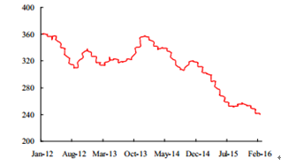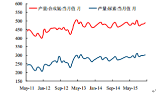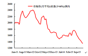 2015 年 12 月份我國合成氨產量 489.1 萬噸,同比上漲 4.68%;尿素產量 301.98 萬噸,同比上升 10.33%。不過尿素價格繼續下跌,2 月份尿素月度均價為 1340 元/噸,環比下跌 3.6%。