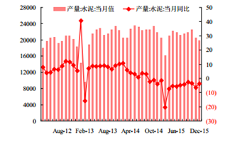 2015 年 12 月份我國水泥產量 19797.40 萬噸,同比下降 3.70%。2 月 26 日,全國水泥均價為 239.33 元,較1 月底下降 0.69%。