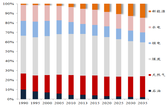新能源在全球發電來源的比重(2016-2035年)