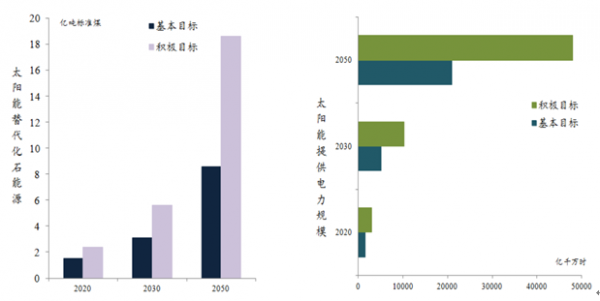 根據分析:分為基本目標和積極目標,在基本目標下,2020年、2030年和2050年,太陽能應用將替代化石能源分別超過1.5億、3.1億和8.6億噸標準煤,其中提供電力分別為1500億、5100億和21000億千瓦時。在積極目標下,2020年、2030年和2050年,太陽能應用將替代化石能源分別超過2.4億、 5.6億和18.6噸標準煤, 其中提供電力分別為3000億、 10200 億和48000億千瓦時。同時,實現上述目標將獲得巨大的環境和社會效益。在基本和積極目標下,2050 年當年二氧化碳減排量將分別達到21.5億噸和46.5億噸。