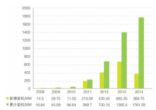 2014 年,我國共有5 家風電機組制造商向國外出口風電機組,已發運出口189 臺,已發運容量共計368.75MW。截至2014 年底,我國風電機組制造商已出口的風電機組共計937 臺,累計容量達到1,761.25MW。在風電機組制造商中,金風科技出口量最大,占總出口量的48.44%。2008 年-2014 年我國歷年風機出口情況如下:
