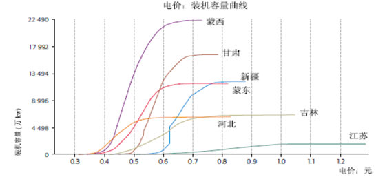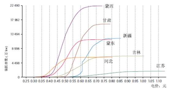 利用地理信息系統(GIS),根據地形地貌特征、地面觀測和衛星遙感數據,以及電網分布等資料,結合經濟評價分析,計算每平方千米的網格單元還本付息電價和實際可裝機容量,進而繪制出七大風電基地的風電供應曲線(GSC)對我國七大風場的經濟開發總量進行預測,具體如下: