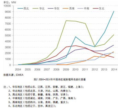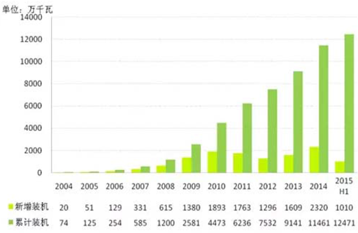 2004 年-2015 年期間我國總體新增及累計裝機容量與分區域累計裝機容量如下所示: