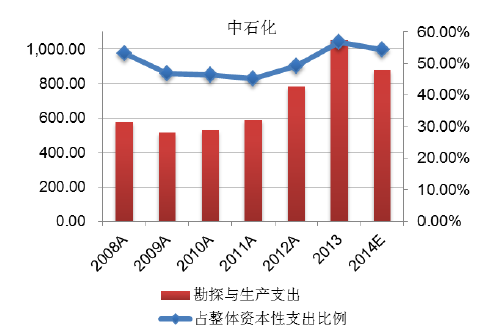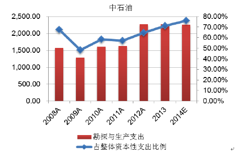 油氣對外依存度提高給國家能源安全帶來了不利影響,決定了我國必須加大勘探開發力度以提高油氣資源的自給率。同時國內油氣開采已逐步進入難動用油藏階段,對技術要求更高,單位產量的資本支出也將隨之提高。近年來,中石油、中石化石油勘探與生產資本性支出總體呈波動增長態勢。2014年,中石油、中石化勘探與生產資本性支出分別達到2,214.79億元和801.96億元。
