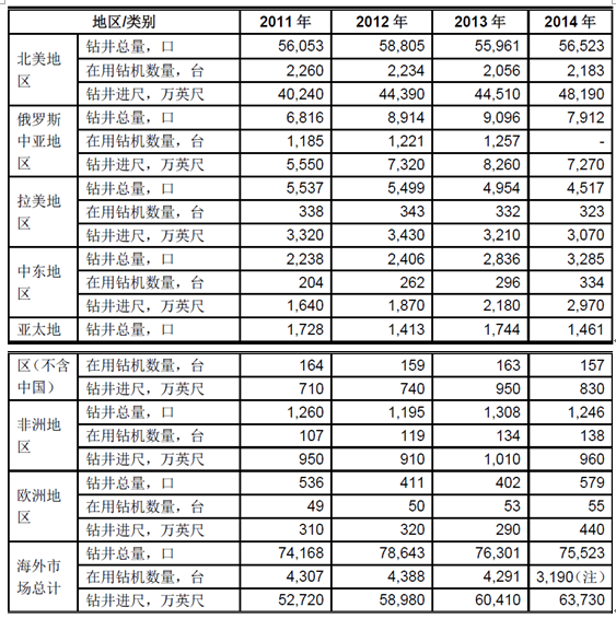 2011年-2014年,海外陸上鉆井活動繼續增加,鉆井總量震蕩上漲,鉆井進尺持續增長。