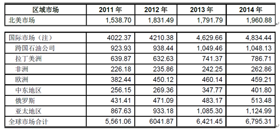 海外鉆井相關服務隨著鉆井數量增加,裝備、服務和耗材價格上升,2012年-2014年市場規模保持增長。