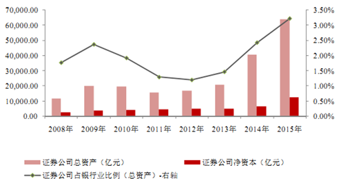 截至 2015 年 12 月末,銀行業金融機構總資產達 199.30 萬億元;而同期證券公司總資產僅為6.42萬億元,僅占銀行業總資產的 3.22%。中國證券公司凈資本總體較小,整體抗風險能力相對其他金融機構較弱,尤其是凈資本較小的證券公司。