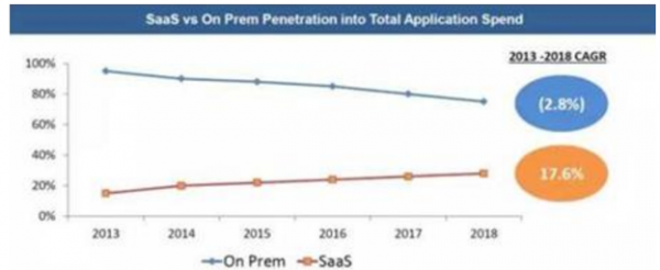 據(jù) Gartner 最新預(yù)測,2015 年企業(yè)應(yīng)用軟件市場規(guī)模將同比增長 7.5%達 1500 億美元,其中基于 SaaS 云服務(wù)的企業(yè)軟件將成為驅(qū)動企業(yè)軟件市場增長的主要動力。根據(jù) IDC 的預(yù)測,未來幾年 SaaS 的滲透率還會進一步增加,預(yù)計到 2018 年達到總應(yīng)用支出的 30%(2013 年為 17%),對比占比逐年下降的本地軟件,SaaS 的主導成為確定趨勢。