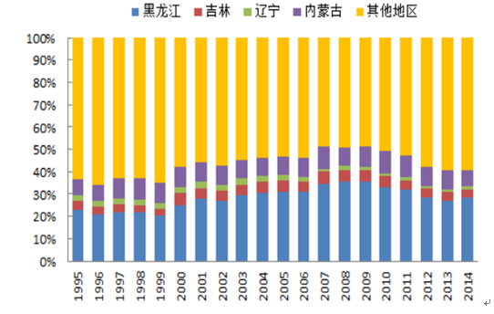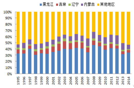 大豆喜溫喜水,適宜在溫暖的環境下生長,對于水分要求較多,而且又是短日照作物。從本質上而言,東北和內蒙古并非是大豆的理想產地,單產也僅在全國處于中游水平。但東北地大物博、土地資源較為豐富,適合大規模機械化作業。而大豆較為適宜機械化種植,因此東北仍是全國最主要的大豆產地。