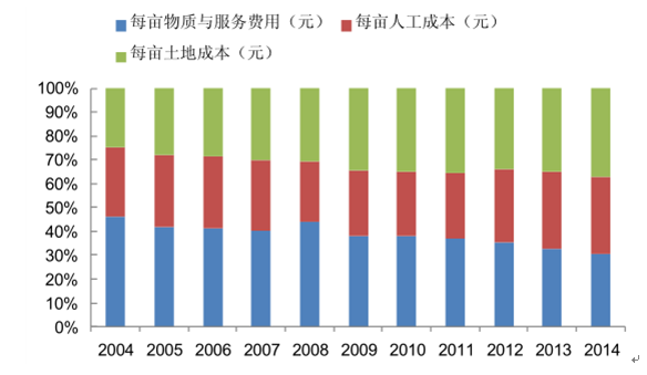 大豆種植相對人力要求較少,人力成本在總成本中占比不到三成。因此,盡管人力成本近幾年來大幅增長,但對于大豆的總成本提升并不如棉花那么明顯。雖然大豆價格下跌的確令每畝種植收益下滑,14 年開始大豆種植也開始出現虧損,但每畝虧損僅 25 元左右,尚不至于觸發行業進入快速去產能階段。