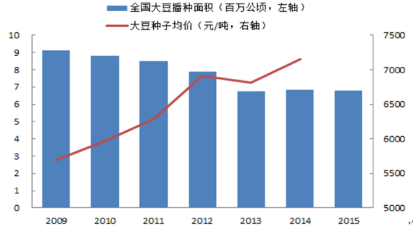 盡管大豆種植面積近年來逐年減少,但大豆種子價格卻在過去幾年中呈現明顯上升趨勢。 除了 2013 年由于大豆種植面積驟減 10%以上,大豆種子價格才出現微幅下跌外,其余年份均明顯上漲。這主要是因為種子占種植成本較低,農民對于種植質量更為看重,而非種子價格。隨著高產的新種子陸續推出,種子價格也一路上漲?傮w而言,種子價格走勢更多取決于品種的競爭力和大豆種植面積,與大豆的價格關系不大。大豆取消收儲并未對大豆種植產生嚴重影響,因此對于種子價格影響也較為有限。
