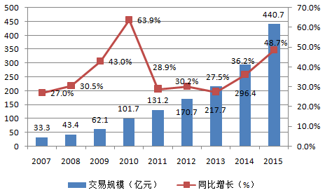 2013-2015年中國電影在線票務市場收入與內地總票房對比