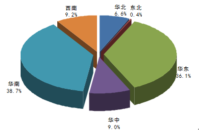 2015年1-9月我國華東地區家用空調產量為4470.42萬臺,占同期國內總產量的36.1%;華中地區家用空調產量為1111.41萬臺,占同期國內總產量的9.0%;西南地區家用空調產量為1142.20萬臺,占同期國內總產量的9.2%;華南地區家用空調產量為4791.66萬臺,占同期國內總產量的38.7%。