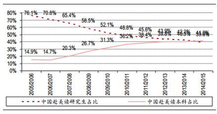 出國留學呈現低齡化趨勢。早在 2005/06 學年,中國赴美國的留學生中,攻讀研究生學位學生約為攻讀本科學位學生的 5 倍,隨后二者之間的差距逐年縮小,2014/15 學年,攻讀本科學位學生首次超過攻讀研究生學位學生。