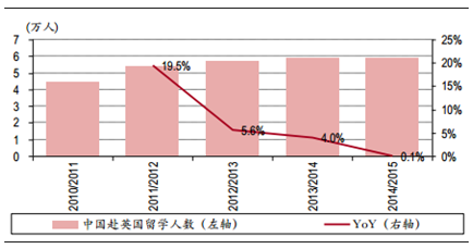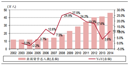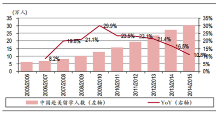 核心提示:2008-2010 年,我國出國留學人數迎來爆發式增長,同比增速超過 20%,隨后增速放緩,步入穩定增長期。2014 年,出國留學總人數為 45.98 萬人,同比增長 11.1%。中國赴美國和英國留學人數呈現相似的趨勢。自 2009/102008-2010 年,我國出國留學人數迎來爆發式增長,同比增速超過 20%,隨后增速放緩,步入穩定增長期。2014 年,出國留學總人數為 45.98 萬人,同比增長 11.1%。中國赴美國和英國留學人數呈現相似的趨勢。自 2009/10 學年起,中國超過印度成為美國最大留學生源國,但赴美留學人數增速逐年下滑,2014/15 學年,赴美留學人數達到 30.4 萬人,同比增長 10.8%,占美國國際學生總數的 31.2%。而中國赴英國留學人數同比增速已降至個位數,2014/15 學年,赴英國留學人數為 5.9 萬人,同比增長 0.1%。