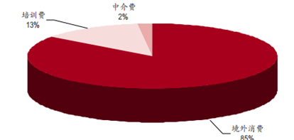 留學行業市場規模超過 2,000 億元,但多為境外消費。根據《2013 年出國留學趨勢報告》統計,2013 年中國留學行業市場規模達到 2,000 億元,假設 10%的年化增長率,預計 2015 年中國留學行業市場規模約 2,400 億元。從中國留學行業的結構看,學費、生活費等境外消費占比約 85%,國內留學服務消費(留學語言培訓+留學中介服務)占比僅為 15%。假設留學行業比例保持穩定,預計2015 年中國留學服務行業規模約 360 億元,其中留學語言培訓約 310 億元,出國中介服務約 50 億元。考慮到留學服務行業市場規模有限,留學服務機構紛紛擴展產業鏈,切入境外租房等留學后市場,令境外消費回流。