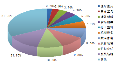 從我國電子商務(wù)網(wǎng)站所處的行業(yè)分布來看,排在前十名的依次為:服裝鞋帽、紡織化纖、農(nóng)林畜牧、數(shù)碼家電、機(jī)械設(shè)備、化工塑料、食品糖酒、建筑建材、五金工具、醫(yī)療醫(yī)藥,其中服裝鞋帽和紡織化纖占比分別為13.8%和10.5%。