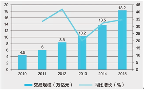 2010-2015年中國電子商務(wù)交易額及增長情況
