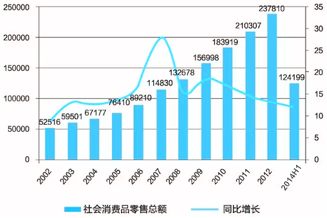 2002-2014年我國社會(huì)消費(fèi)品零售總額及增長情況