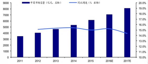2011-2017年中國(guó)醫(yī)美市場(chǎng)規(guī)模增長(zhǎng)預(yù)測(cè)