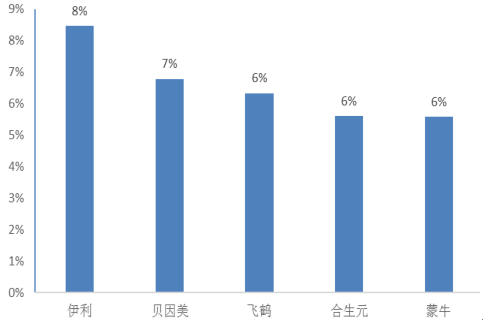 雅士利銷售收入有望達到 55 億,市場份額達到 7%,成為第二大本土奶粉企業(yè),僅落后伊利 2pct,飛鶴、貝因美、合生元分列國產(chǎn)奶粉品牌三四五位,國產(chǎn)奶粉前五大品牌市占率達到 33%。