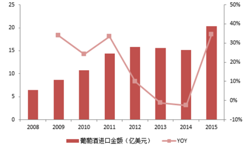 2015年葡萄酒進口額同比增長34.33%